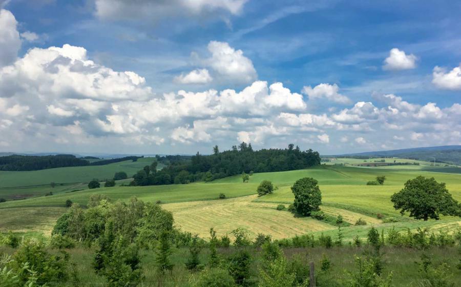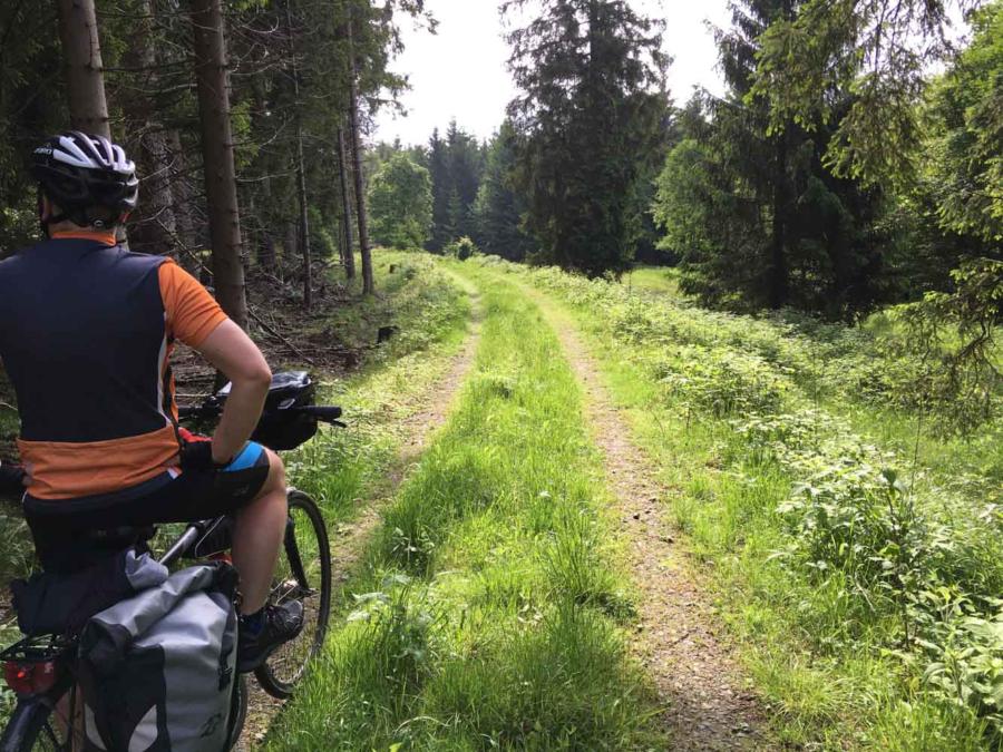 »»Tourverlauf (GPX) auf Komoot anschauen Die Wolkenbrüche hinter uns gelassen, bei freundlichem Wetter zunächst querfeldein, dann in rasanter Abfahrt nach Bad Sachsa hinab. Kurz danach - nach Bartofelde - wieder mal eine Komoot Überraschung. Links abbiegen, wo kein Weg, sondern nur ein Hügel ist. Egal, mutig die Räder hinaufgeschoben, landeten wir auf dem Grünen Band aka Kolonnenweg - der Grenzlienie zwischen BRD und DDR. Die Räder humpeln und hüpfen über den Plattenweg, das Auge schweift durch die Landschaft. Endlose Weiten, kaum eine Siedlung. Natur pur. Wunderschön.