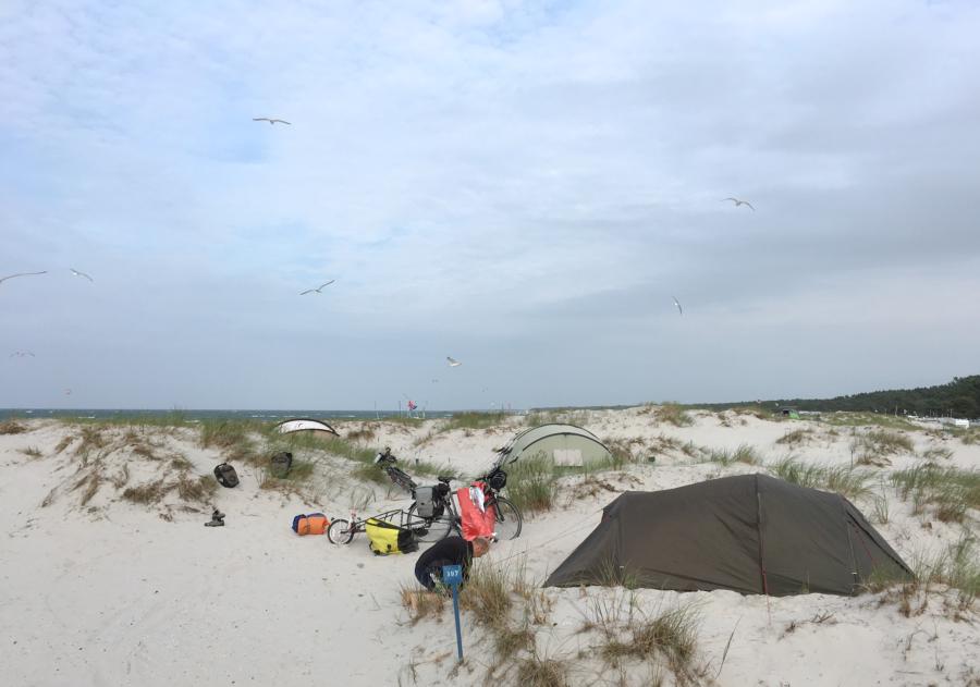 Zelten in den Dünen ist klasse! Wind und Sand überall, Zeltplanen knattern im Wind; Möwen schreien über den Köpfen, hinten rauscht das Meer.