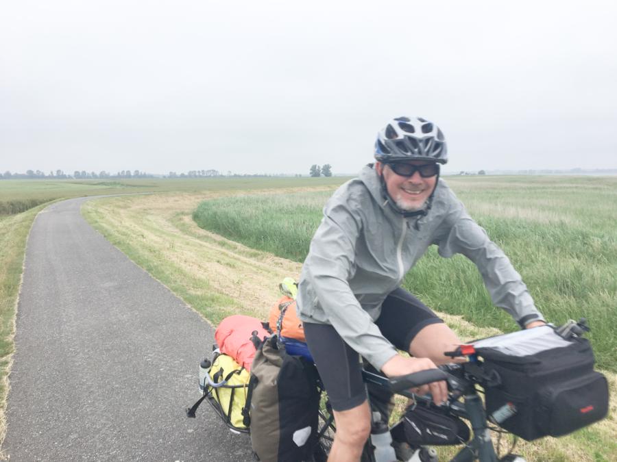 Der Wind hat nun gedreht; er kommt nicht mehr von hinten, sondern schön direkt von vorn. Dafür ist wenigstens das Gelände eben. (Den Bob Yak Anhänger merkt man auf ebener Strecke nur beim Anfahren. Im hügeligen Gelände aber flucht man bis man heiser ist.)