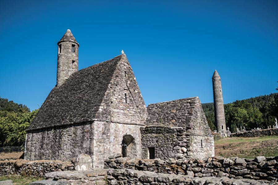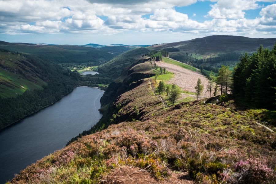 In unmittelbarer Nähe (und zu Fuß über den Wicklow Way erreichbar) liegt Glendalough; Ein Tal an zwei Seen mit einer alten Klostenanlage. Hiervon ausgehend starten mehrere Wanderwege (farblich kodiert). Wir entscheiden uns für die 9km lange blaue Wanderung und landen nach der Hälfte des Weges auf einem Bergkamm mit einer spektakulären Sicht auf die Seenlandschaft. Beeindruckend!