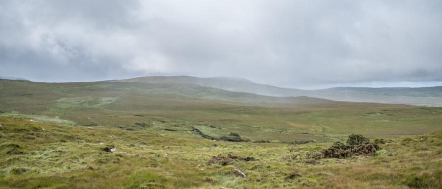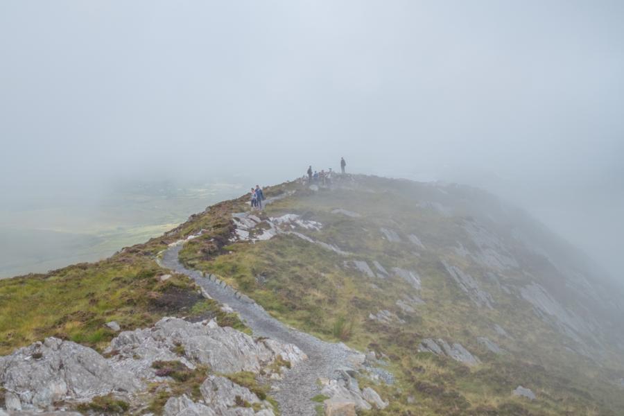 Der Connemara Park bietet einem das “ursprüngliche” Irland an. Endlose Weiten der hügeligen Landschaft, Heidegebiete gehen in Berge über. Auf einen solchen Berg - den Diamond Hill - steigen wir. Oben bläst ein kräftiger Wind, Regen peitscht ins Gesicht. Aussicht gibts nicht, dafür stimmungsvolle Nebelbilder. Der Rundweg mitsamt Aufstieg dauert ca. 3 Stunden; es geht etwa 400 Höhenmeter hinauf. Genug, um ins Schwitzen zu kommen.