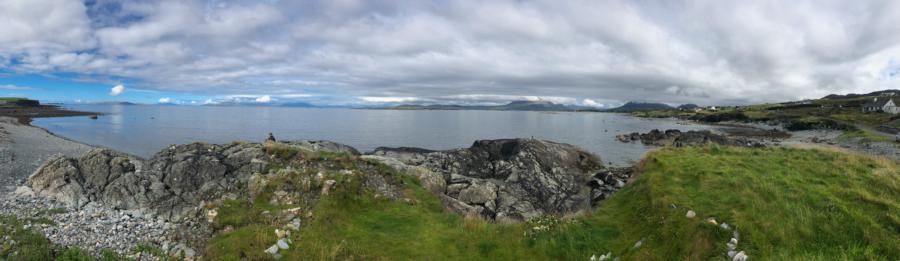 Zufällig sind wir an eine Stelle gekommen, die uns sehr gefallen hat - der Küstenabschnitt am Rinvyle Castle. Rechts von uns grasende Pferde, vor uns kleine Inseln. Herrlich! Das dort unmittelbar gelegene B&B wäre die perfekte Unterkunft gewesen, war aber ausgebucht. Von der Lage nicht zu toppen.
