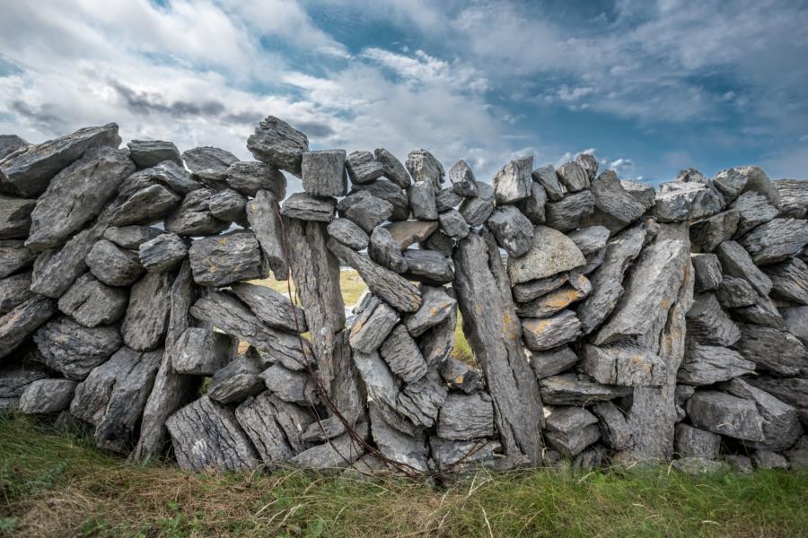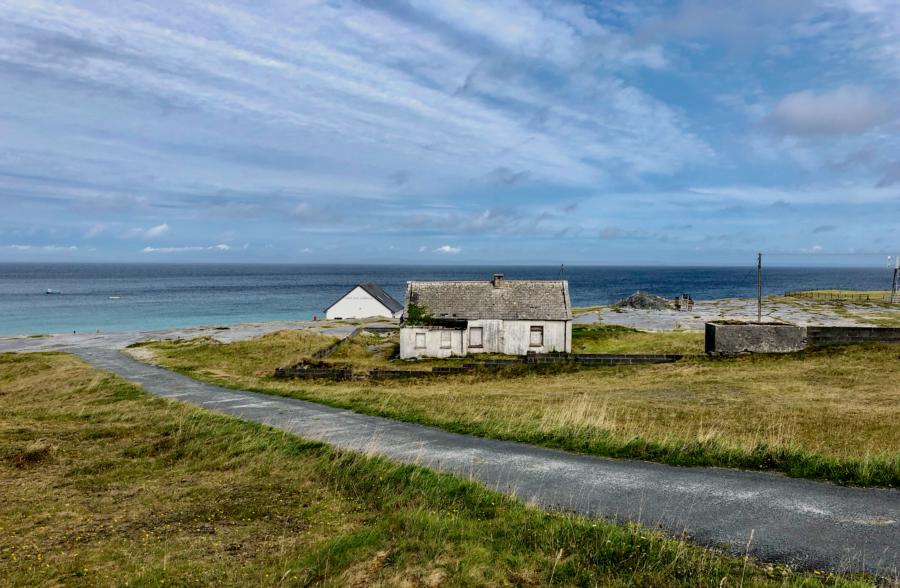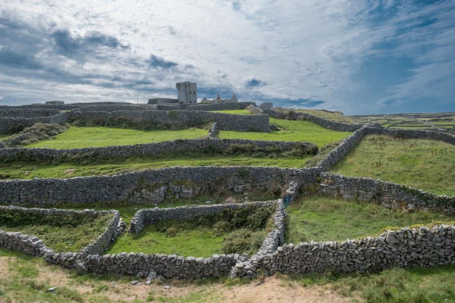 Inisheer (und vermutlich auch die anderen Aran Inseln) ist baumlos; das teils gesteinige, teils mit Gräsern bewachsende Land ist komplett mit den auch sonst häufig zu sehenden Steinmäucherchen parzelliert; das gibt etwas Windschutz und hält das Vieh am Platz. Wir hätten uns Räder leihen sollen; zu Fuß ist der Weg an der Küste reizvoll, aber quer über die Inel läuft man nur zwischen den Mäucherchen. Das ermüdet. Das auf Inisheer gestrandete Bootswrack haben wir nicht besichtigt, dafür die Ausssicht von O’Brians Castle.