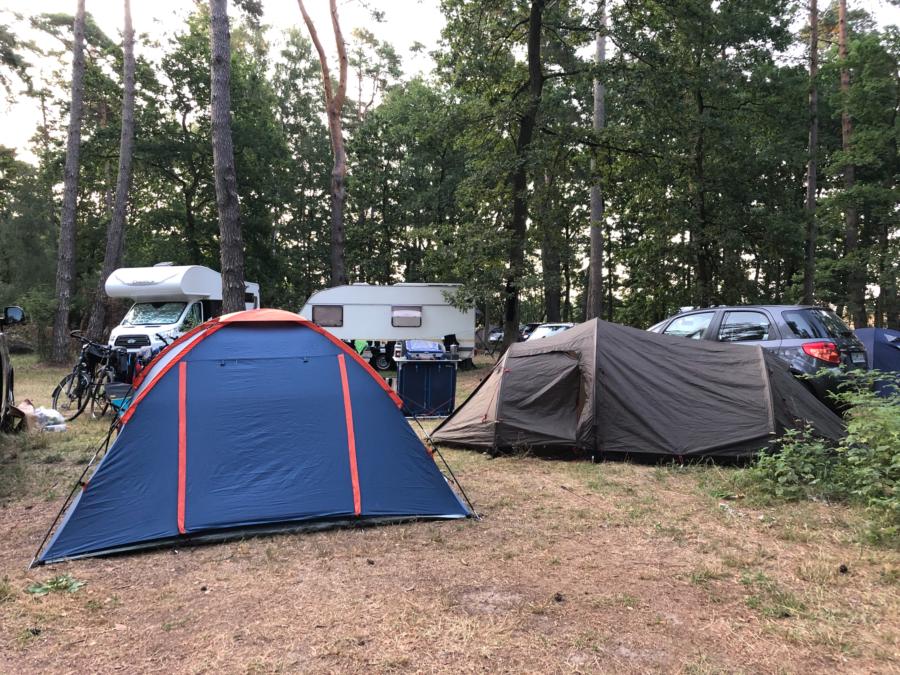 Bei 30 Grad kamen wir um 17:00 an. Der Campingplatz liegt direkt an der Müritz in einem Kiefernwäldchen. Obgleich viel los war, haben wir noch einen Platz gefunden. Der Platz selber ist nicht strukturiert; jeder baut sein Zelt da auf wo es ihm passt. Wege gibt es auch nicht wirklich welche, dafür ein paar breitere Pfade. Nachts im Dunkeln ist es dann gar nicht so leicht sein Zelt zu finden.