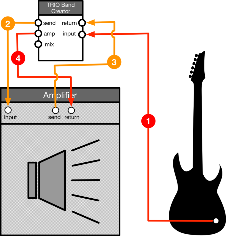 Der einfachste Weg, den Gitarrenverstärker mit dem Trio zu verkabeln ist wie im Bild angegeben:
