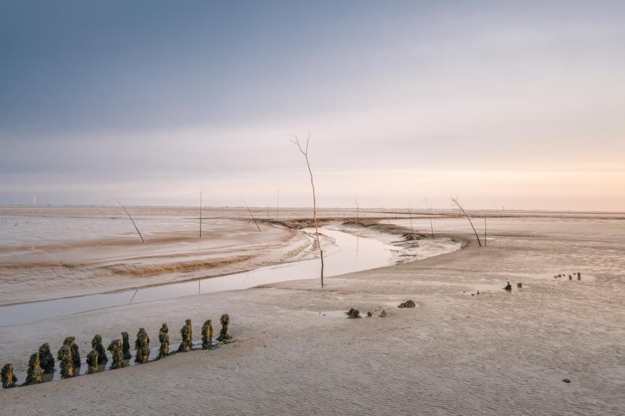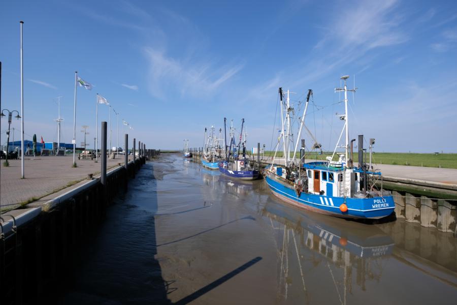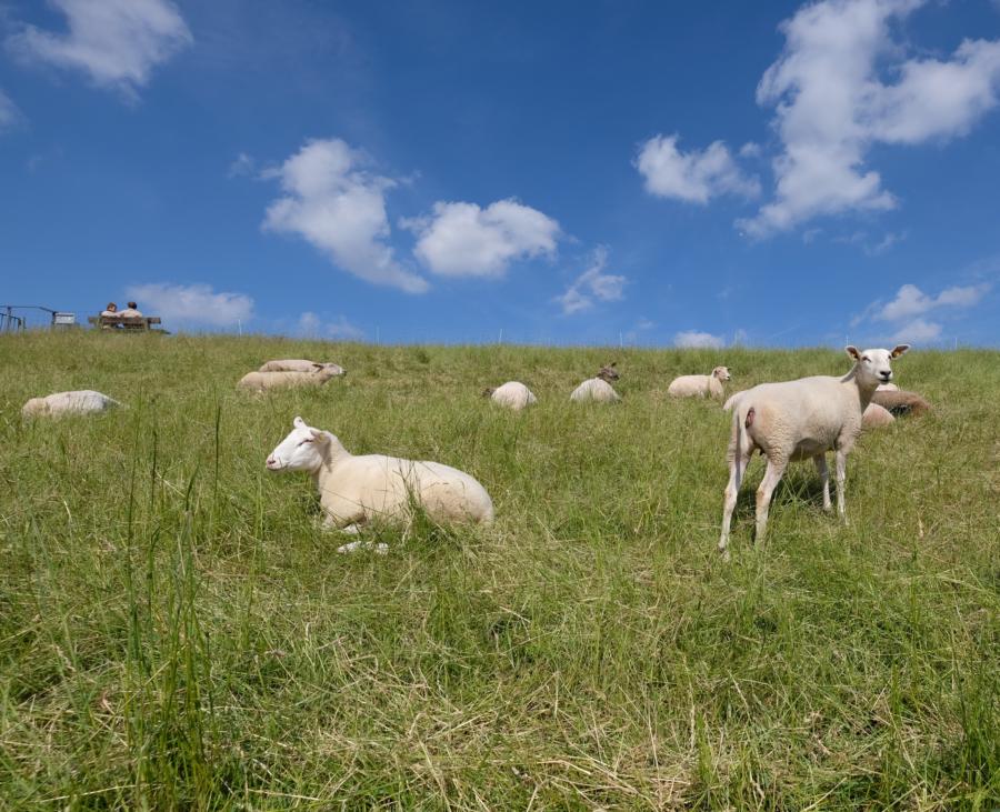 Kaum hat man den letzten Hafen hinter sich gelassen, kommt das Nordseefeeling. 8 Meter hohe Deiche, darauf Schafe, dahinter das Watt.