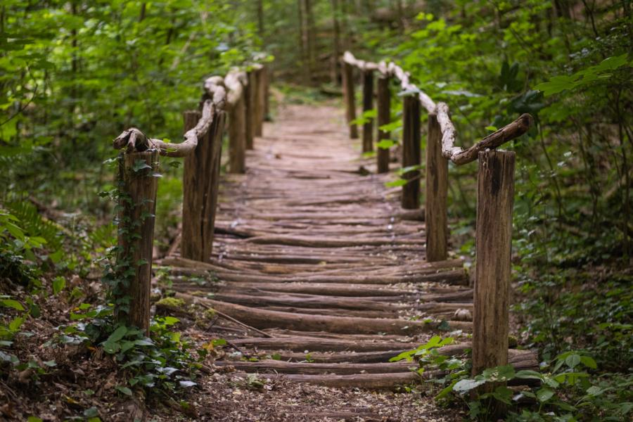 Aber auch wenn man nicht Höhenluft schnuppern kann, der Wald ist wunderschön. Zunächst kommt man an einem “Belvedere” Aussichtspunkt vorbei (auch dieser Name kann nicht ganz die Erwartungen erfüllen), und kurz danach taucht man ein in einen Urwald. Der Weg führt um ein altes Ziegeleigelände herum, welches immer noch in Betrieb ist. Durch das Gelände ziehen sich auch an manchen Stellen Gleise, die man zum Transport des Tons nutzte, welcher hier dem Boden entnommen wurde. Eben dieser Tonabbau ist auch für die topologischen Verwerfungen der Landschaft mit verantwortlich.