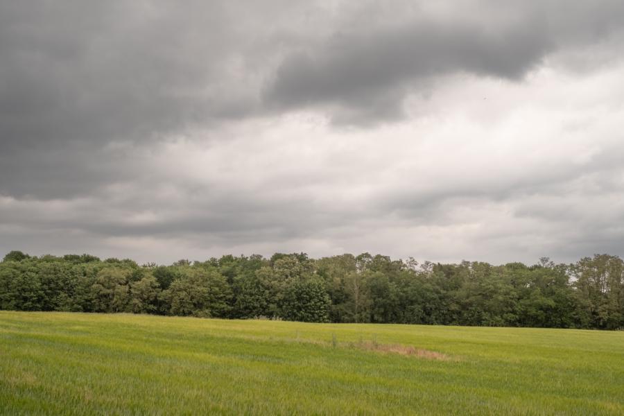 Nach etwa der Hälfte der Strecke (3,5 km) gelangen wir an den Waldrand und laufen an den Feldern entlang. Die Gräser stehen hoch, der Himmel ist bedeckt, der Blick in die Weite der Landschaft nach dem Urwald wunderschön.
