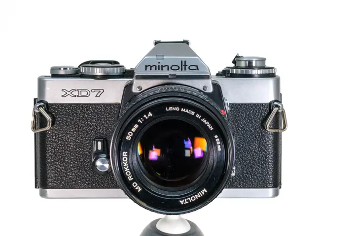 Die Minolta XD-7 wurde 1977 vorgestellt und gilt als eine der wichtigsten analogen Spiegelreflexkameras ihrer Zeit. Sie war die erste SLR, die Zeitautomatik und Blendenautomatik kombinierte und damit eine frühe Form der Programmautomatik bot. Die Kamera verbindet klassische Mechanik mit damals neuer Mikroelektronik und ist bis heute bei Analogfotografen wegen ihres hellen Suchers, der zuverlässigen Belichtungssteuerung und des kompakten Designs beliebt.