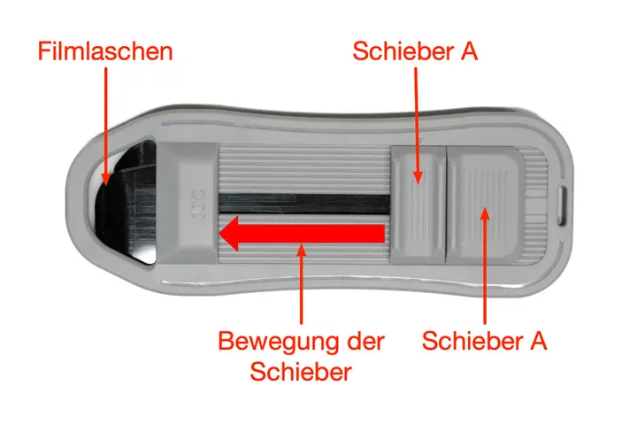 - Film weiter zurückdrehen; der Film rutscht hinter Lasche A, was man an einem kleinen Klick hört.