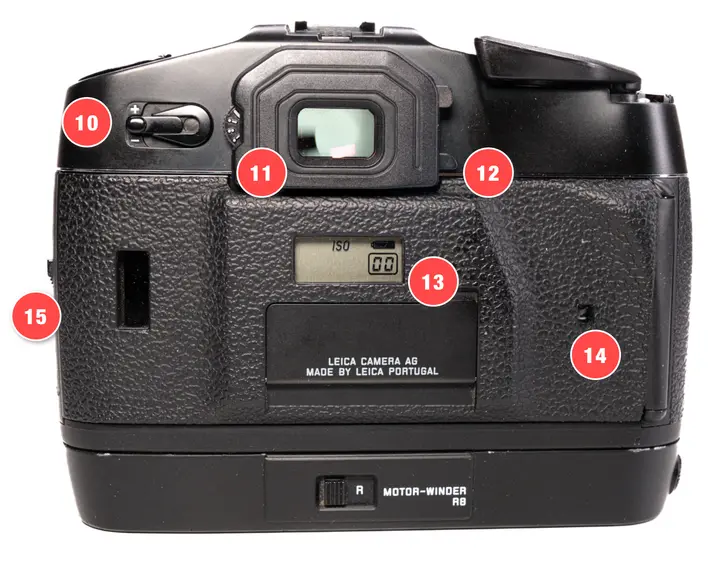 - Info-LCD: Anzeige für Batterie und Bildzählwerk. Wird die unter dem Display liegende Klappe geöffnet, kann eine manuelle ASA und der Selbstauslöser eingestellt werden.