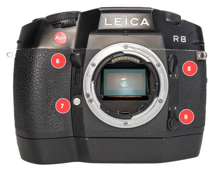 Vor der R8 liegt die Ära der Minolta-Leica-SLRs: Die R3 bis R7 entstanden in Kooperation mit Minolta, und die Gehäuseform trägt entsprechend den typischen Stil japanischer SLRs dieser Epoche.