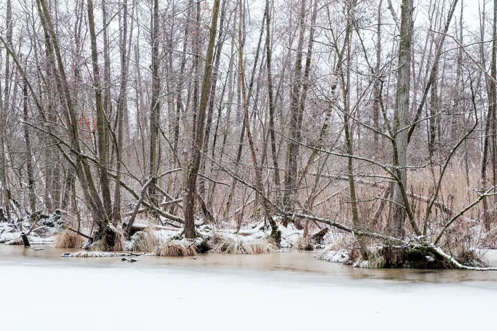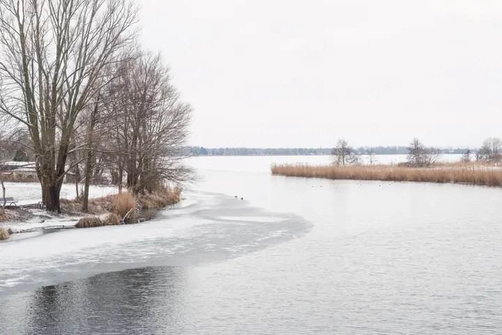In Grube kann man statt des Weges an der Straße oben auf dem Deich laufen und kommt dabei an Teichen vorbei, die nur durch den Deich von der Havel getrennt sind. Die Teiche sind noch komplett zugefroren, sodass man sie auf Fotos auch für Wiesen halten könnte.