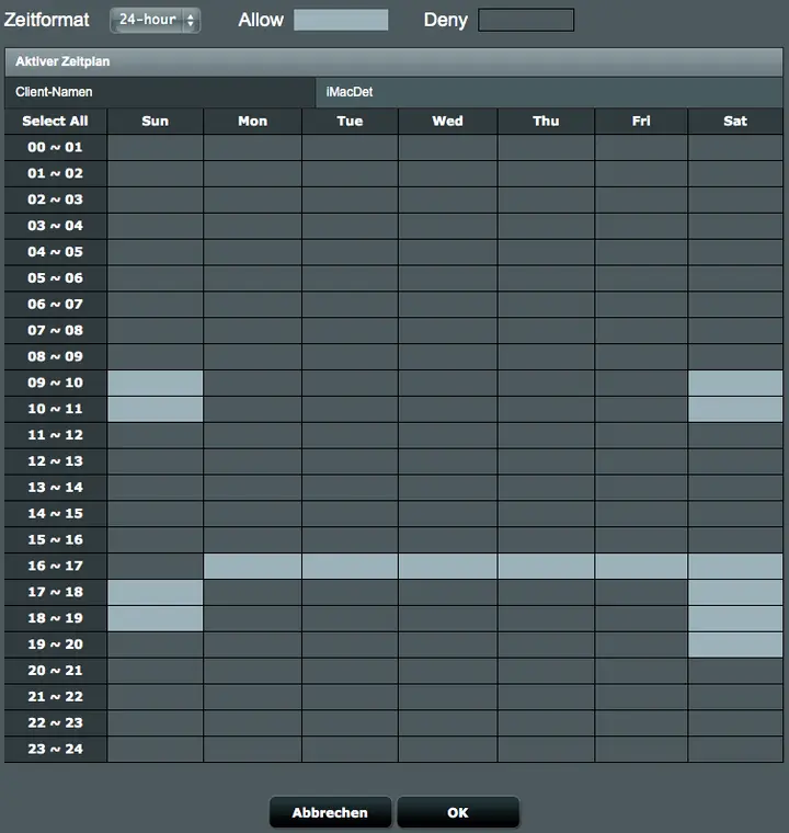 Man wählt das Device aus und kann dann per Dragging (gedrückte Maustaste) über die Zeitfenster fahren, um somit die zulässigen Zeitfenster einzutragen.