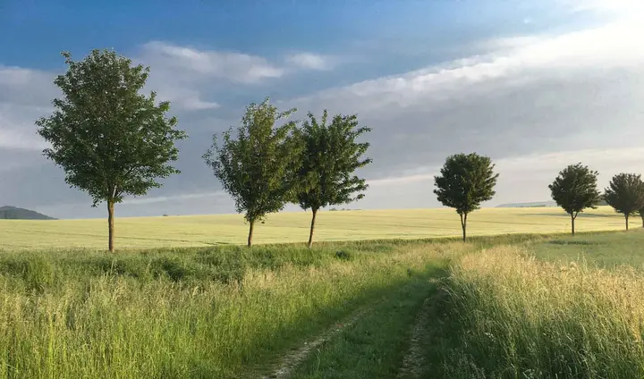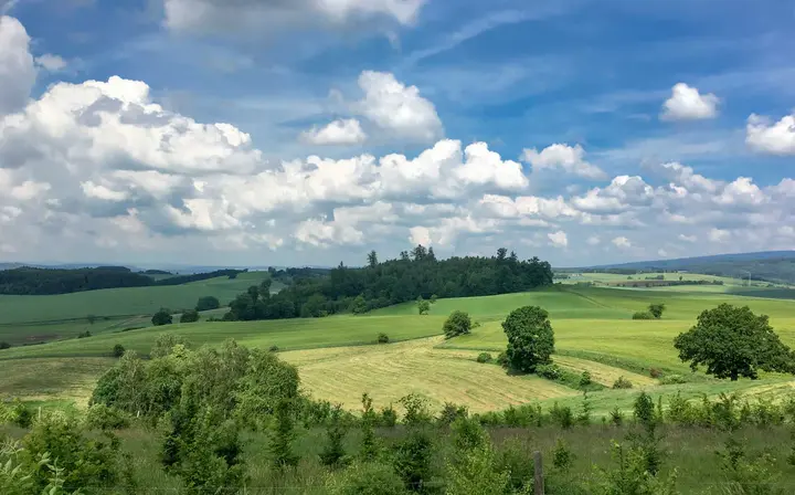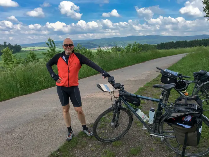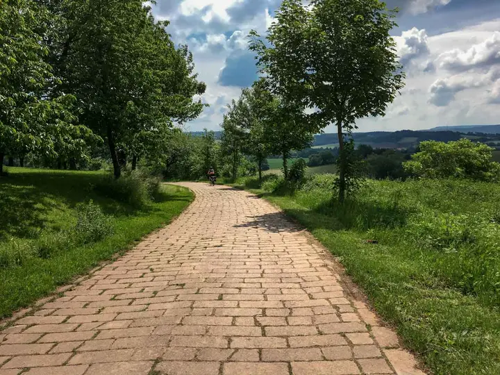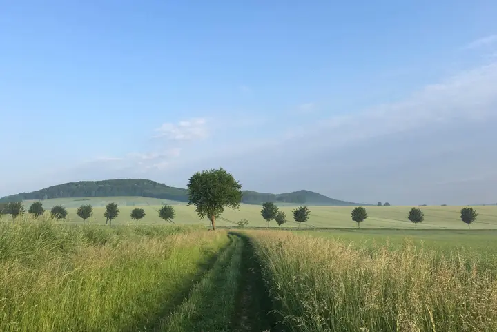 Die Wolkenbrüche hinter uns gelassen, bei freundlichem Wetter zunächst querfeldein, dann in rasanter Abfahrt nach Bad Sachsa hinab. Kurz danach - nach Bartofelde - wieder mal eine Komoot Überraschung. Links abbiegen, wo kein Weg, sondern nur ein Hügel ist. Egal, mutig die Räder hinaufgeschoben, landeten wir auf dem Grünen Band aka Kolonnenweg - der Grenzlienie zwischen BRD und DDR. Die Räder humpeln und hüpfen über den Plattenweg, das Auge schweift durch die Landschaft. Endlose Weiten, kaum eine Siedlung. Natur pur. Wunderschön.