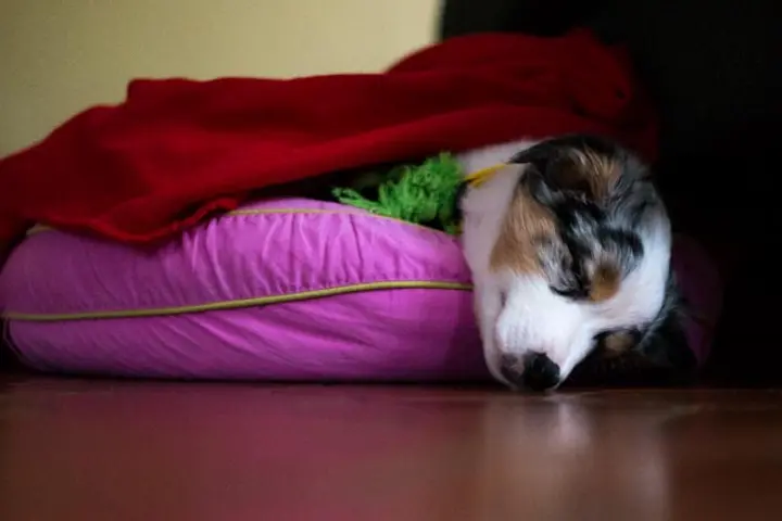 Klar, dass man beim Welpen schlafen muss. Lehrbuch sagt, dass der Hund einen nicht sehen soll. Das funktioniert gar nicht, Milli schreit und jault. Ich schieb meine Matratze vor die Box, nach zwei Minuten pennt sie.