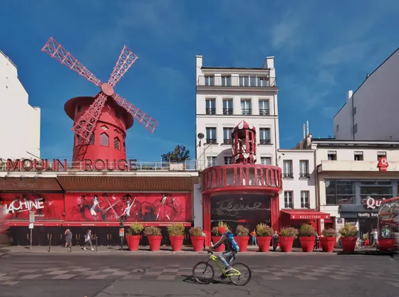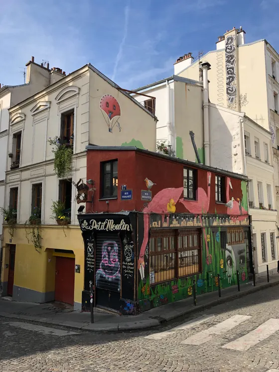Nachdem wir also uns aus Erinnerungen befreien, steigen wir die Gassen des Montamarte hinab und trödeln Richtung “Moulin Rouge”. “Da ist ja eine” ruft mein Bruder; verwirrt frage ich “was!?”, und “wo!?” und drehe den Kopf. “Na die Mühle”. Und plötzlich begreife ich, dass Moulin Rouge kein Eignname eines Etablissements ist, sondern einfach nur rote Mühle heißt. Neben der roten gibt es übrigens noch einige weitere Mühlen auf dem Montmatre, dem (jetzt guck ich lieber bei Wikipedia nach) Märtyrer-Berg.