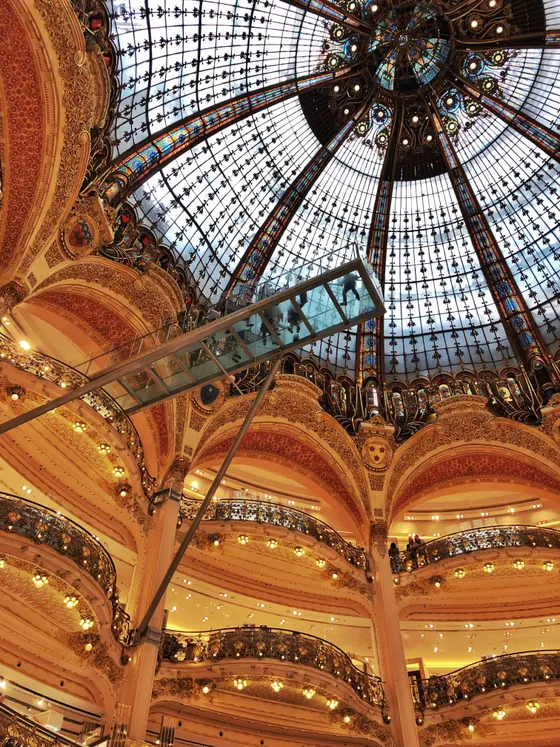 Vom Moulin Rouge laufen wir westwärts bis zum Pigalle Platz, von dort gehts Richtung Süden - SoPi, South Pigalle. In einem tibetischen Restaurant machen wir Pause und stärken uns mit Cafe und Wasser. Weiter gehts zum Galerie Lafayette. In der Kuppel gibts nun einen Sky Walk! Auf der Dachterasse die Aussicht geniessen, und weiter zum Palais Royale. Langsam geht das Marschieren in die Beine!