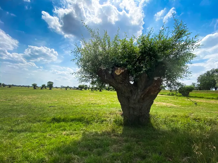 Wir radeln zum Gülper See und dort zur Fischerei Schröder. Diesen Ort hatte ich vorab recherchiert; er liegt nicht ganz auf der Strecke. Aber die paar extra Kilometer lohnen sich. Man sitzt entspannt auf gehäkelten Sitzkissen unter Bäumen, der Fisch ist sehr gut, die Getränke kalt.