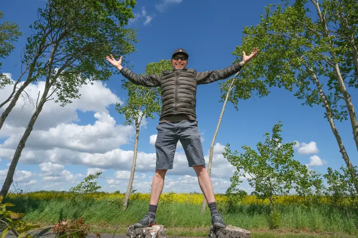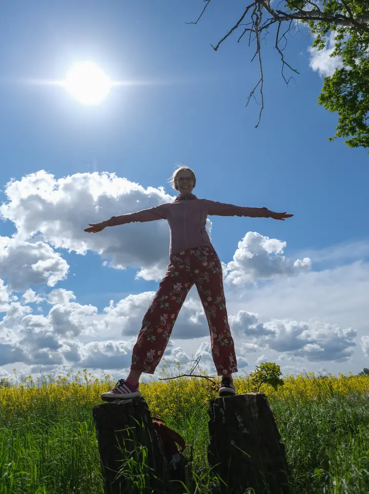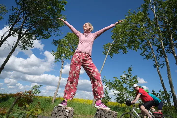 Ein paar Baumstümpfe nutzen wir für eine spontane Fotosession, und freuen uns über das Wetter, das Leben und die verdutzten Blicke der Radler.