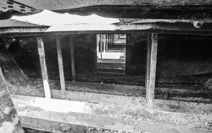 Bevor wir den Deich wieder verlassen, um uns landeinwärts zurück nach Roskow zu schlagen, entdecken wir einen rostigen Kahn neben einer Schleuse. Mir gelingt noch Foto ins Innere, bevor ich vor den dort wohnenden Hornissen flüchte.