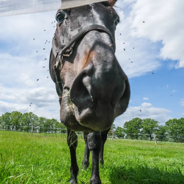 Ich versuche mich an einem Pferdenüstern-Foto (es misslingt), und entdecke später das Gewimmel der Fliegen um den Kopf des Geschöpfs. Ich möchte kein Pferd sein!