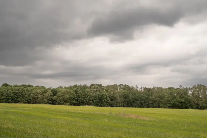 Nach etwa der Hälfte der Strecke (3,5 km) gelangen wir an den Waldrand und laufen an den Feldern entlang. Die Gräser stehen hoch, der Himmel ist bedeckt, der Blick in die Weite der Landschaft nach dem Urwald wunderschön.