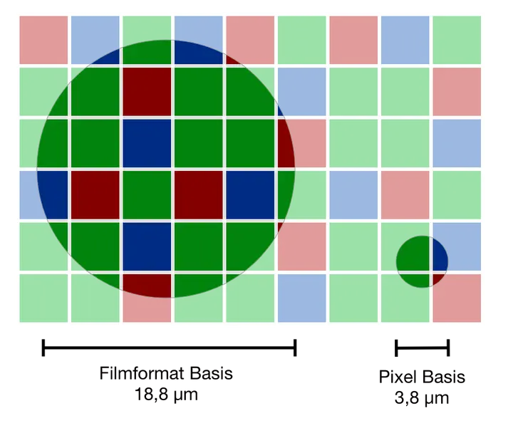 Das folgende Bild veranschaulicht die Größenverhältnisse der Zerstreuungskreise bei den beiden Verfahren. Zu Erkennen ist auch, dass selbst bei der Pixelbasis der Unschärfekreis mehrere benachbarte Pixel betreffen kann.