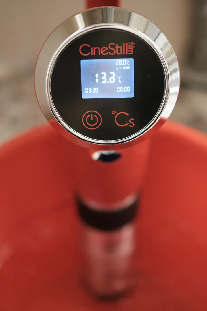 Der Cinestill TCS-1000 funktioniert ähnlich wie ein Sous-Vide-Badeinsatz. Man hängt ihn in ein Wasserbad, stellt die gewünschte Temperatur ein, und das Gerät erwärmt und stabilisiert das Wasser während des gesamten Entwicklungsprozesses. Ein integrierter Umwälzmechanismus sorgt dafür, dass sich eine homogene Temperatur im gesamten Wasserbad einstellt.